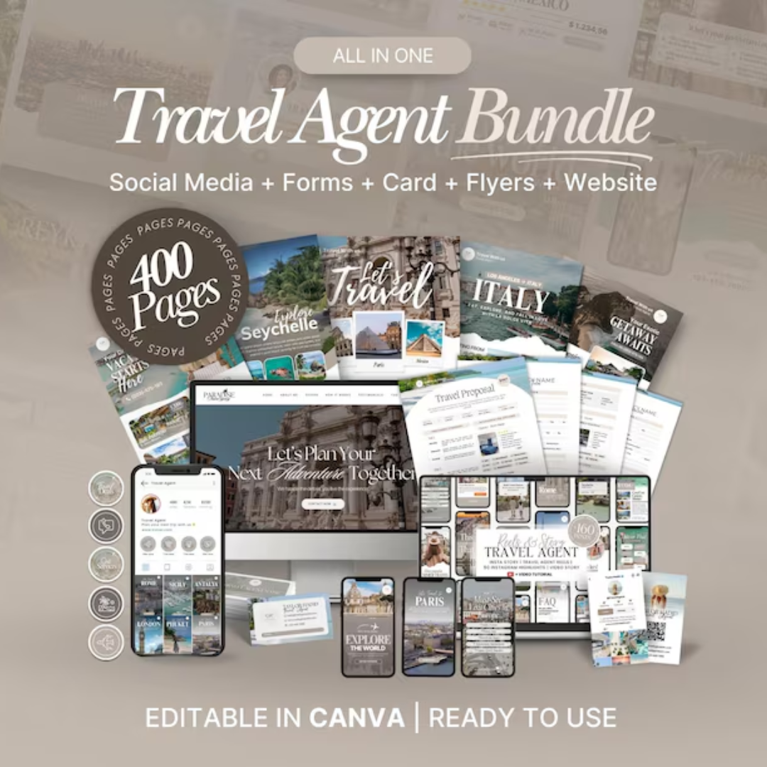 Travel Agent Business Templates: Forms, Proposals, Link in Bio & Social Media (Canva)